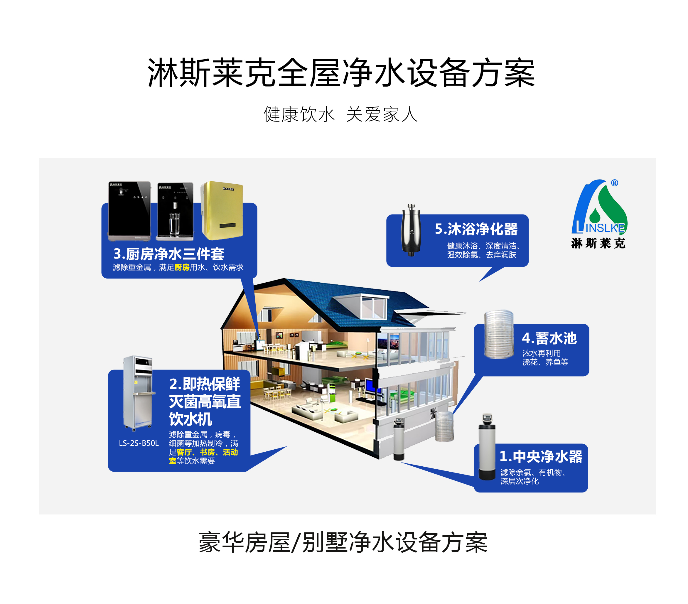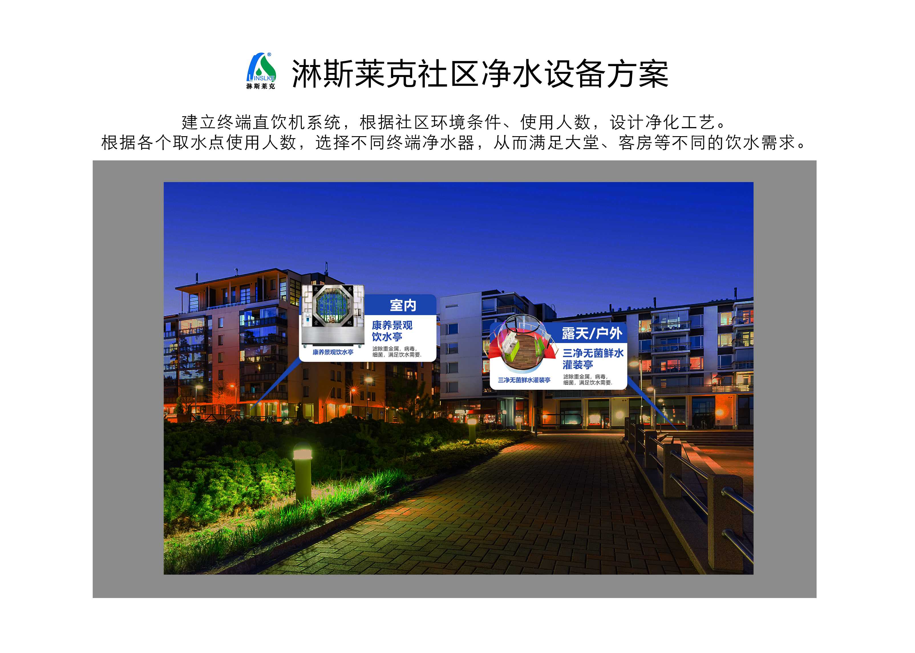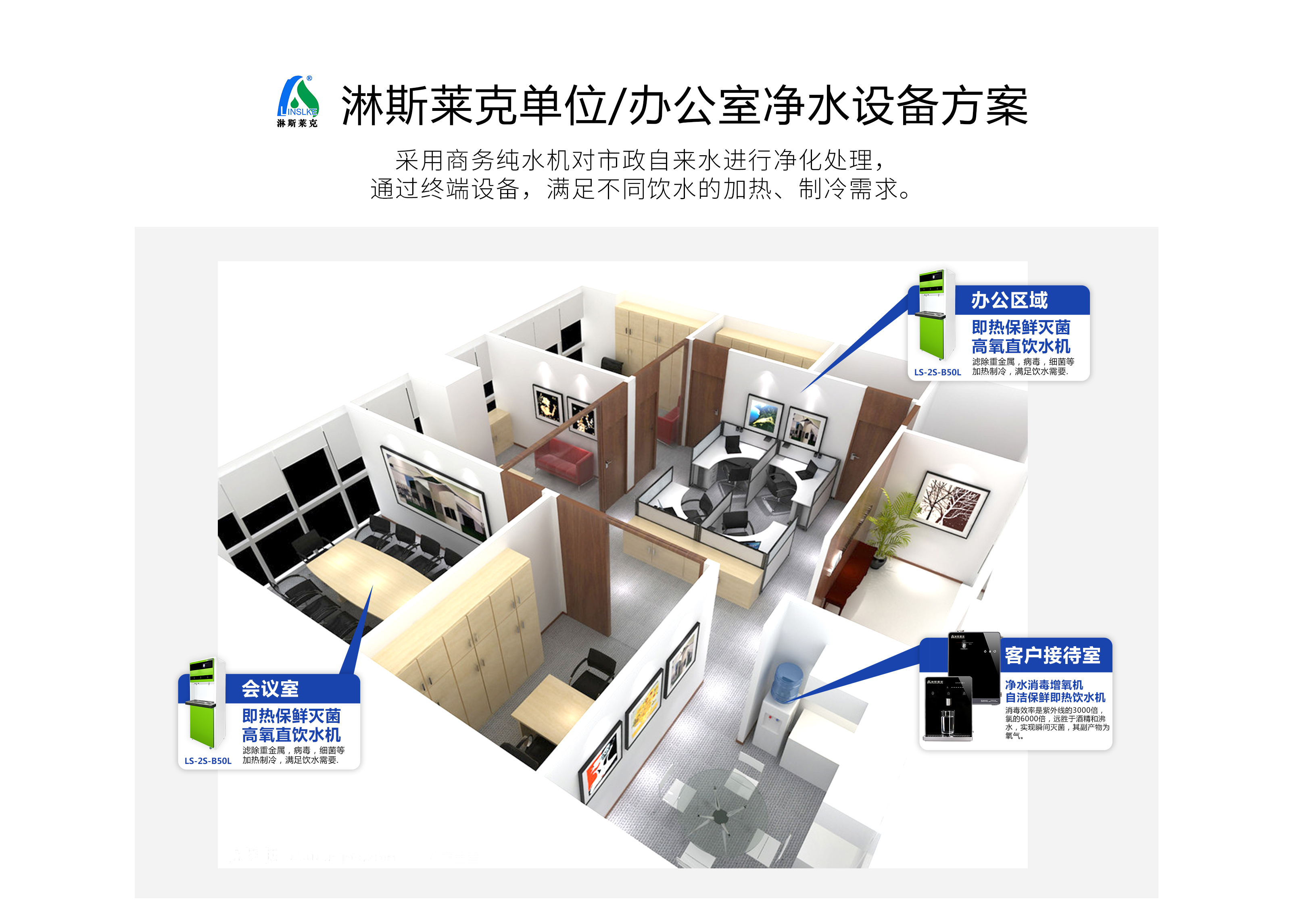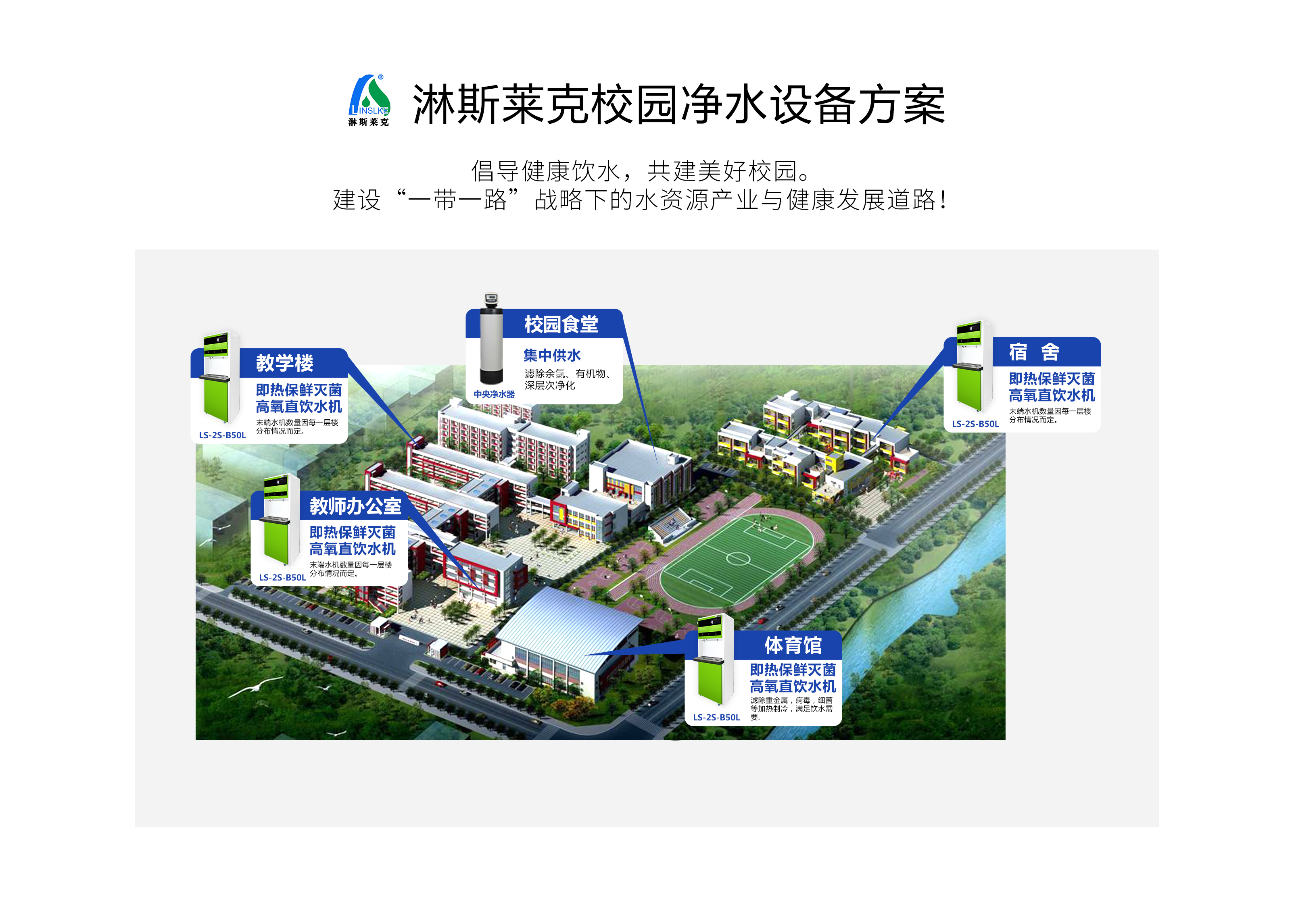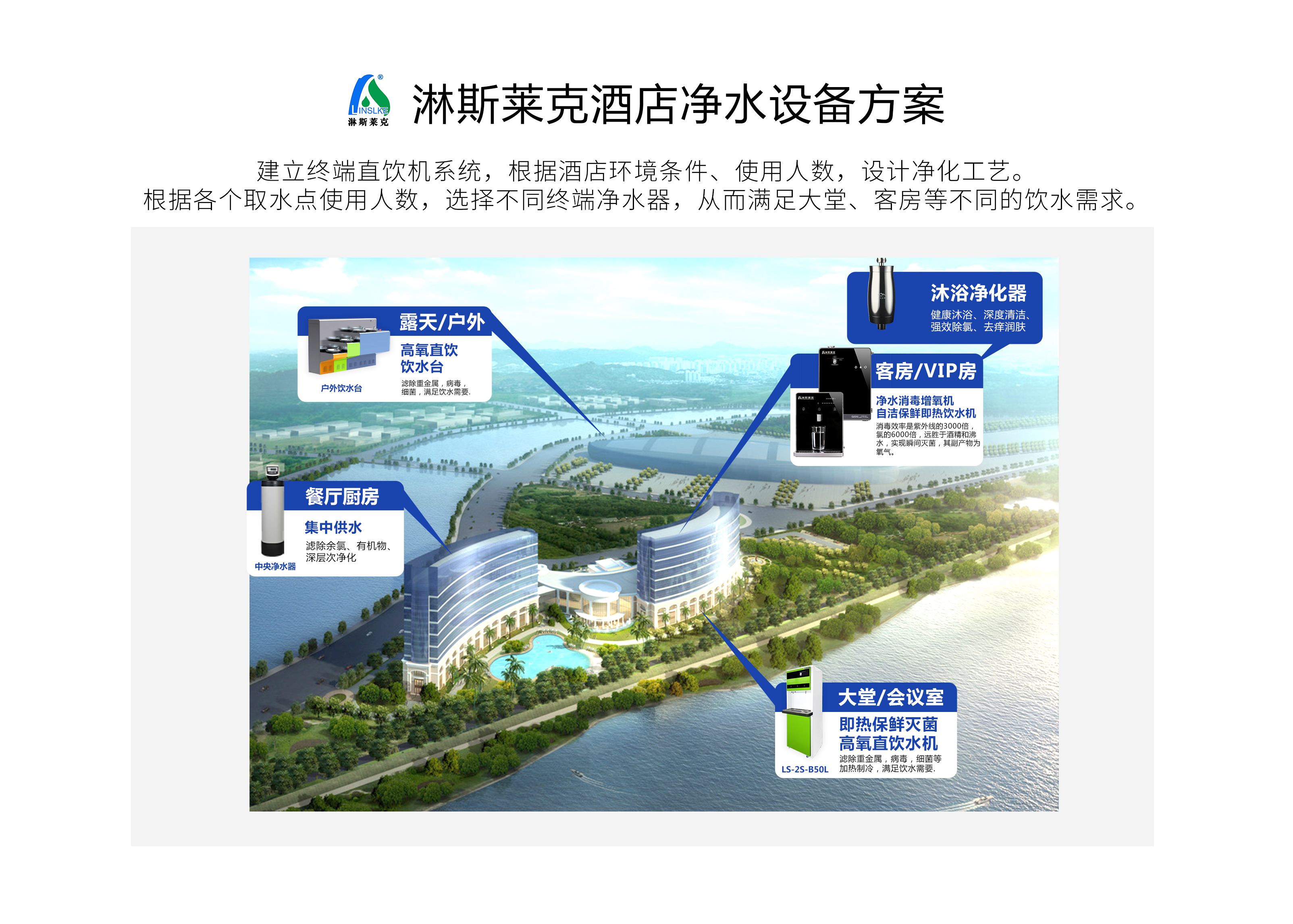 淋斯莱克净水设备系统方案,根据各个取水点使用人数,选择不同终端净水器,从而满足不同的饮水需求。